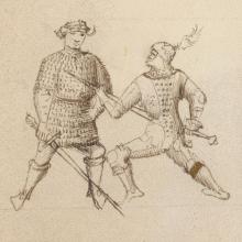This manuscript, along with two others, comprise the earliest illuminated copies of Fiore dei Liberi’s treatise on fencing and martial arts entitled Fior di battaglia (The Flower of Battle).