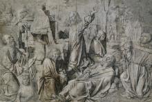 Brush and gray-brown and black ink, and gray wash, heightened with white, on gray prepared paper