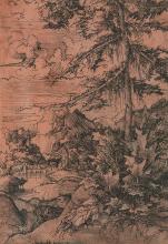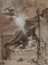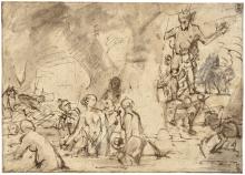 Pen and black ink, brush and brown wash, heightened with white, partially incised, on reddish prepared paper