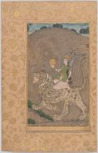 A peri holding an effigy of the sun rides a composite lion (MS M.787)., , , MS M.787 -