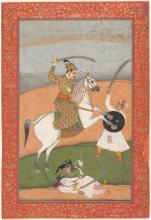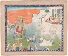 19th century[A raja conversing in a fortress and riding away on an elephant, from a Hamir Hath series]., India, [18--], MS M.1024.1